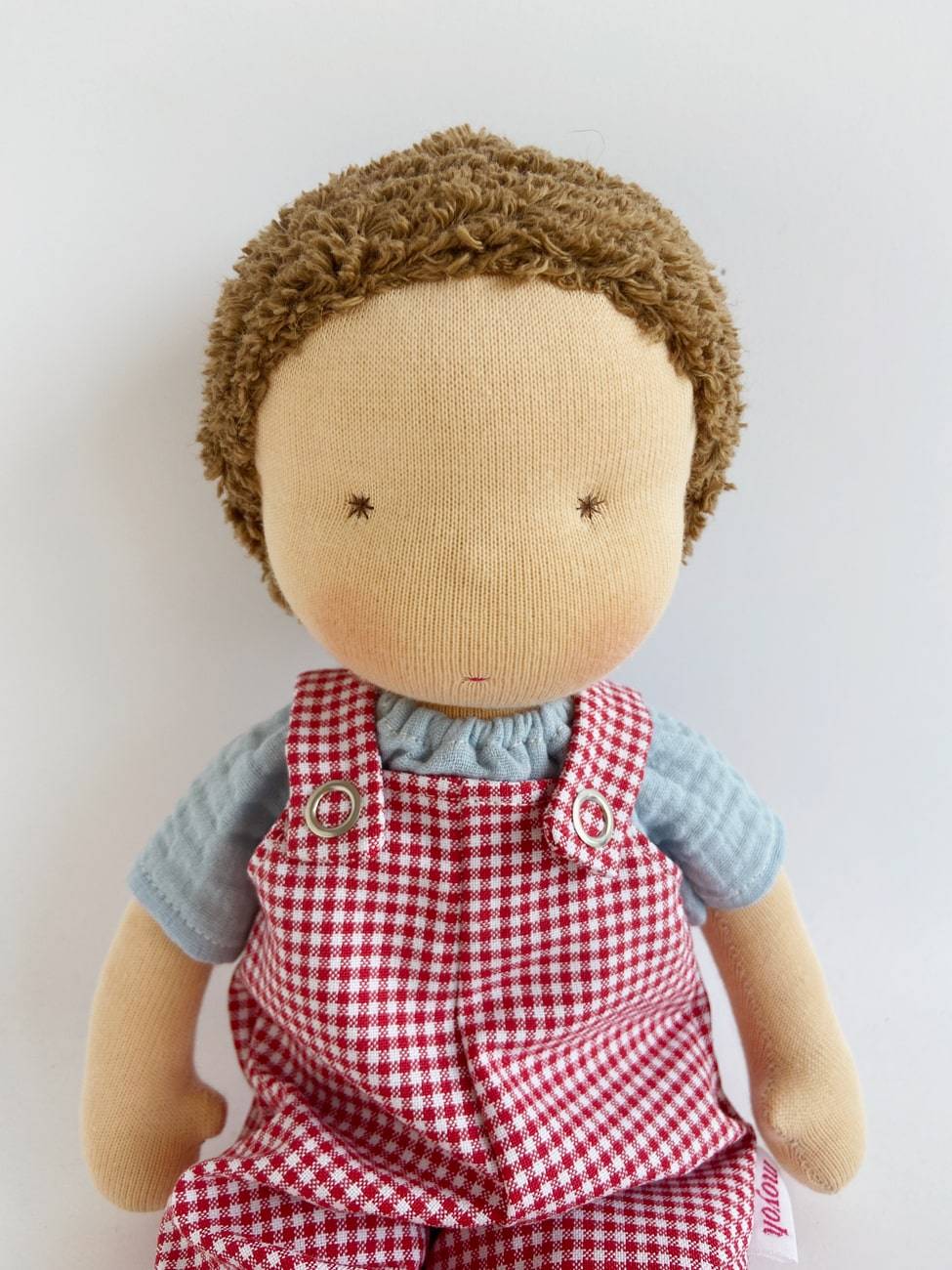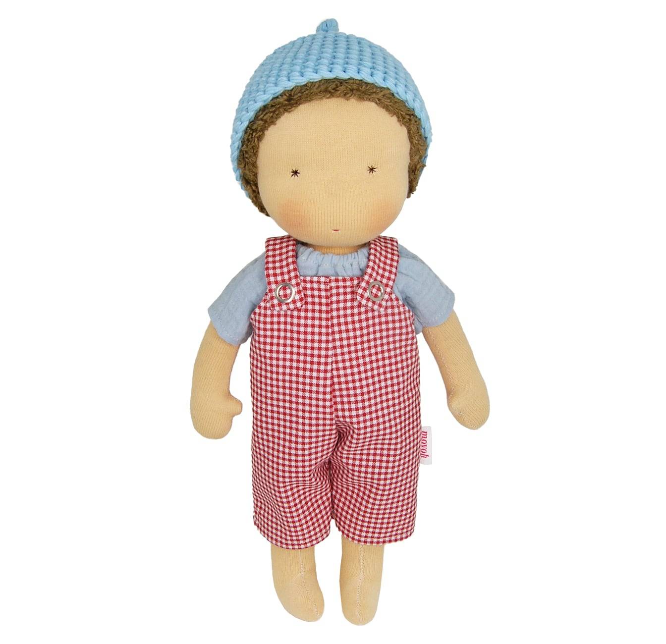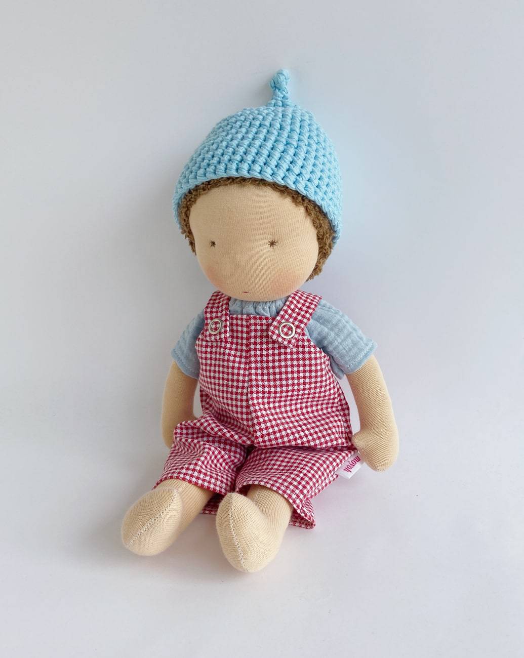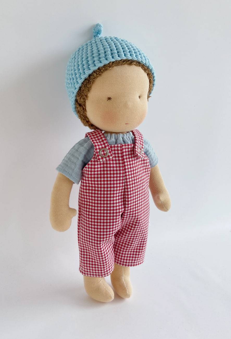 ca. 33 cm, Körper aus Schweizer Puppentrikot, Hose und Hemd aus Westfalenstoff, braunes Haar aus weichem Baumwollplüsch kba, gefüllt mit Schafwolle (kbT), Mütze gefilzt aus feiner Merinowolle, handwaschbar bei max. 30°C, individualisierbar (Haar-/ Hautfarbe, Kleidung kann variiert werden)