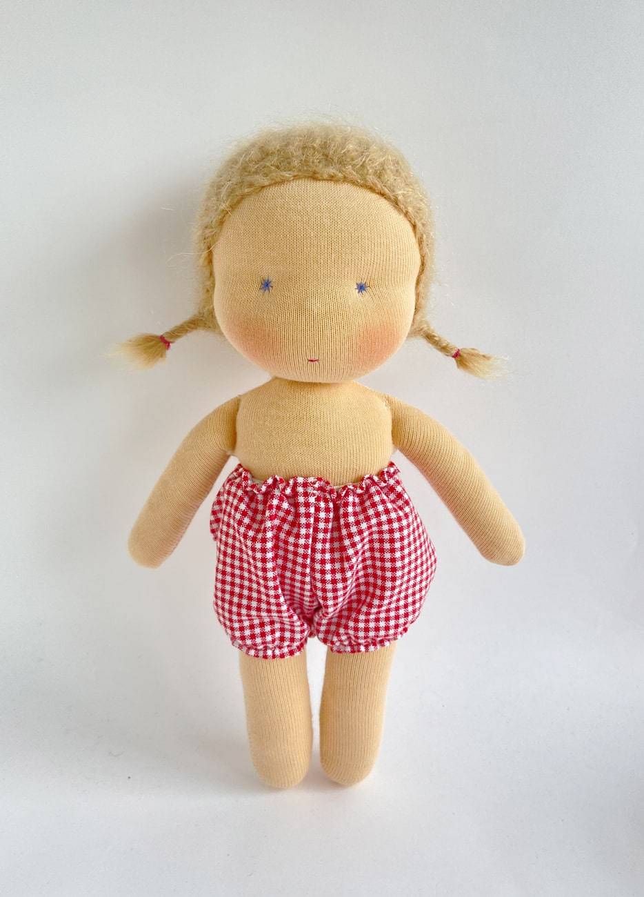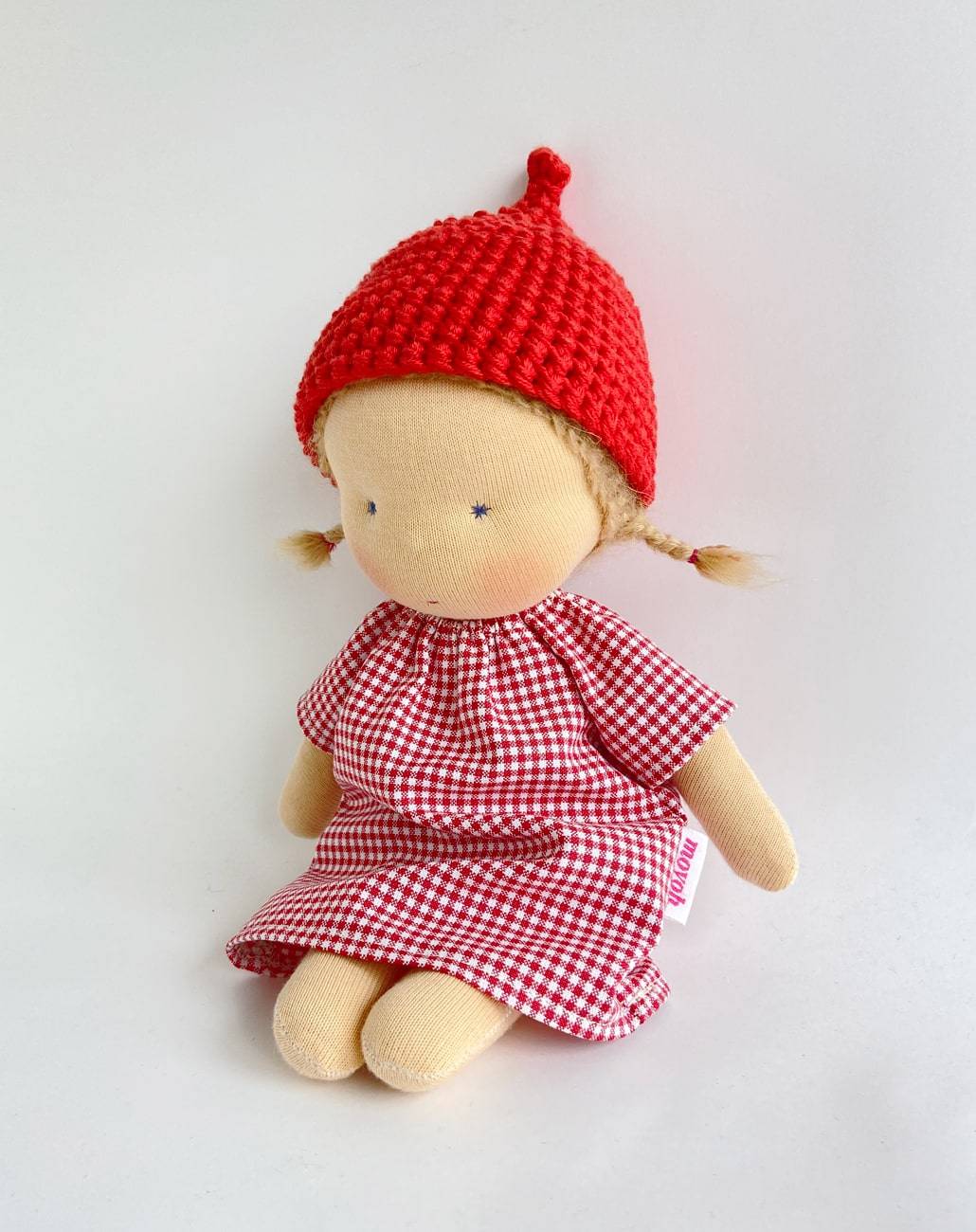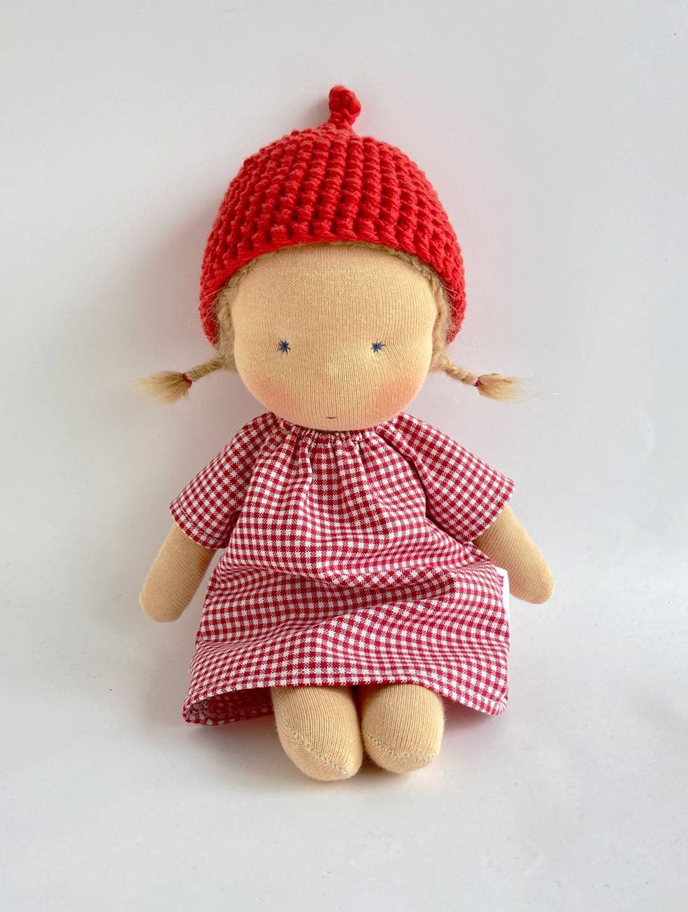 ca. 28 cm, Körper aus Schweizer Puppentrikot, Kleid und Unterhose aus Westfalenstoff, blondes Haar mit kleinen Zöpfen aus weicher Mohairwolle, gefüllt mit Schafwolle (kbT), Mütze aus Baumwollgarn (GOTS), handwaschbar bei max. 30°C