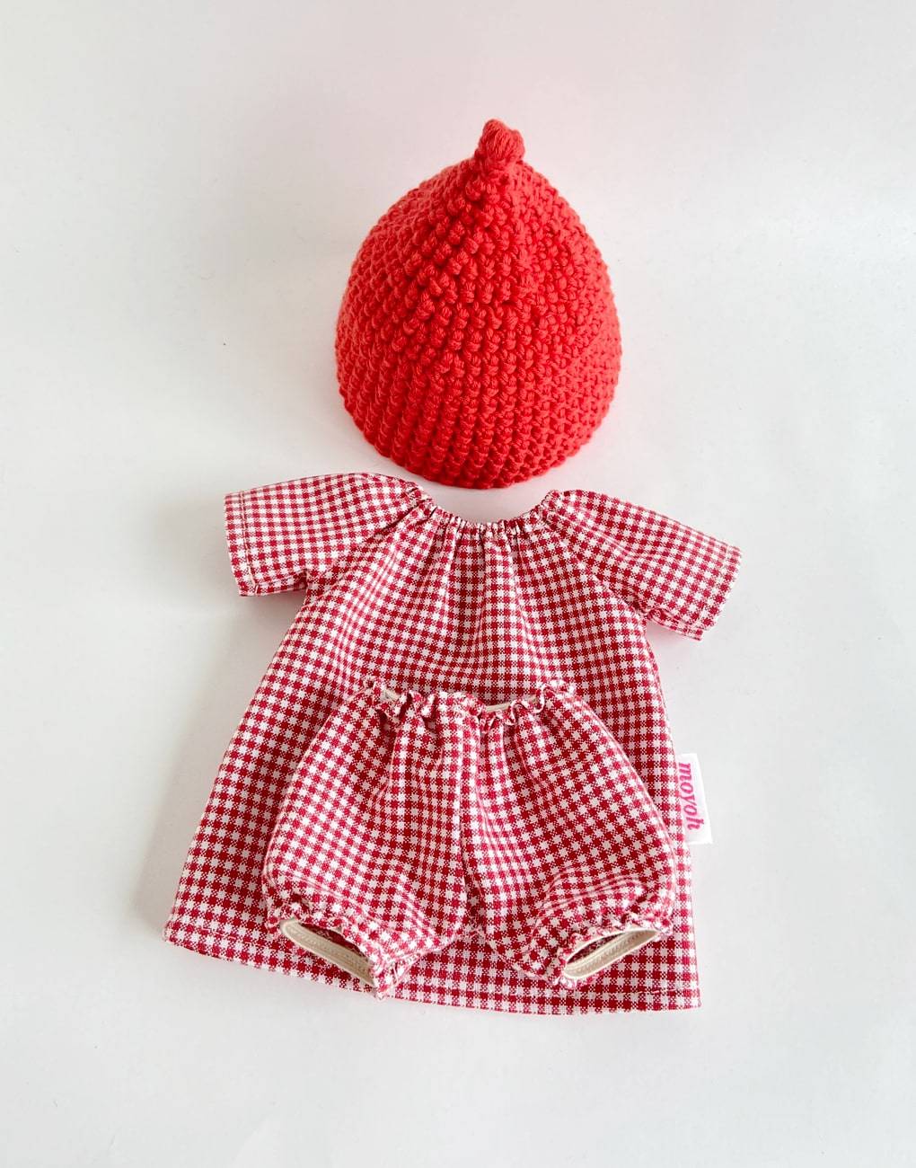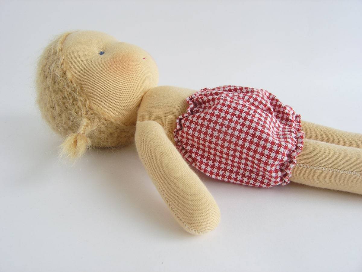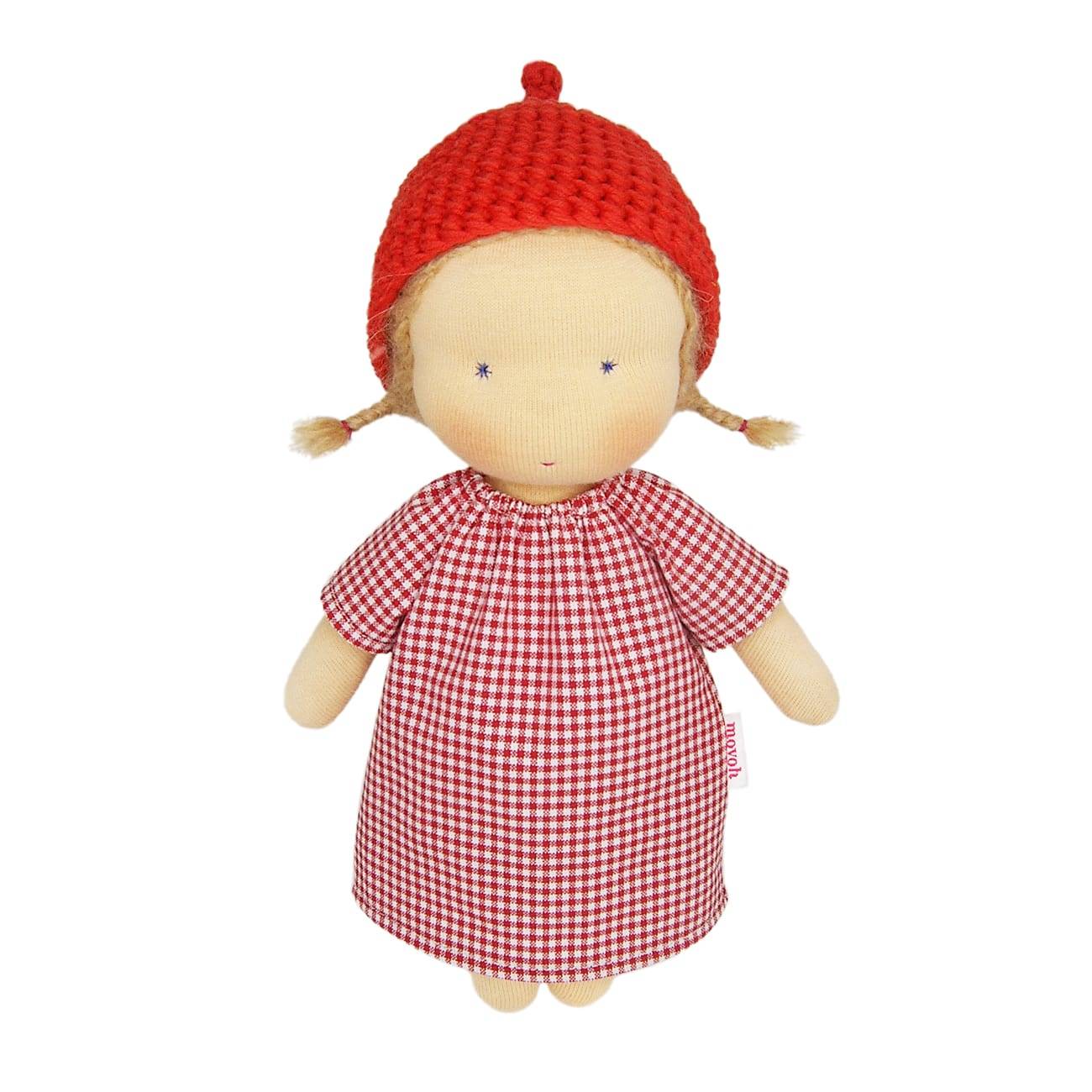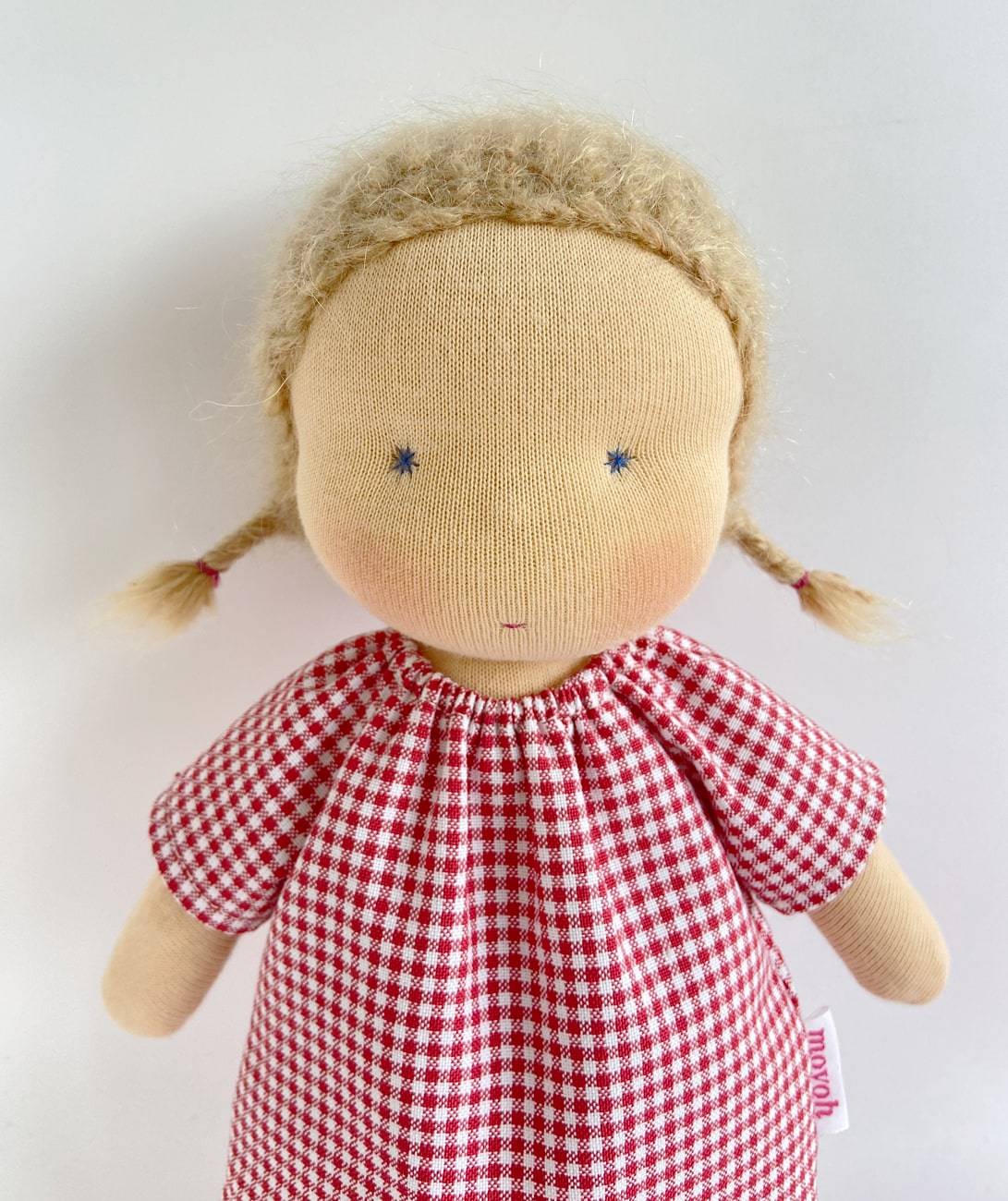 ca. 28 cm, Körper aus Schweizer Puppentrikot, Kleid und Unterhose aus Westfalenstoff, blondes Haar mit kleinen Zöpfen aus weicher Mohairwolle, gefüllt mit Schafwolle (kbT), Mütze aus Baumwollgarn (GOTS), handwaschbar bei max. 30°C